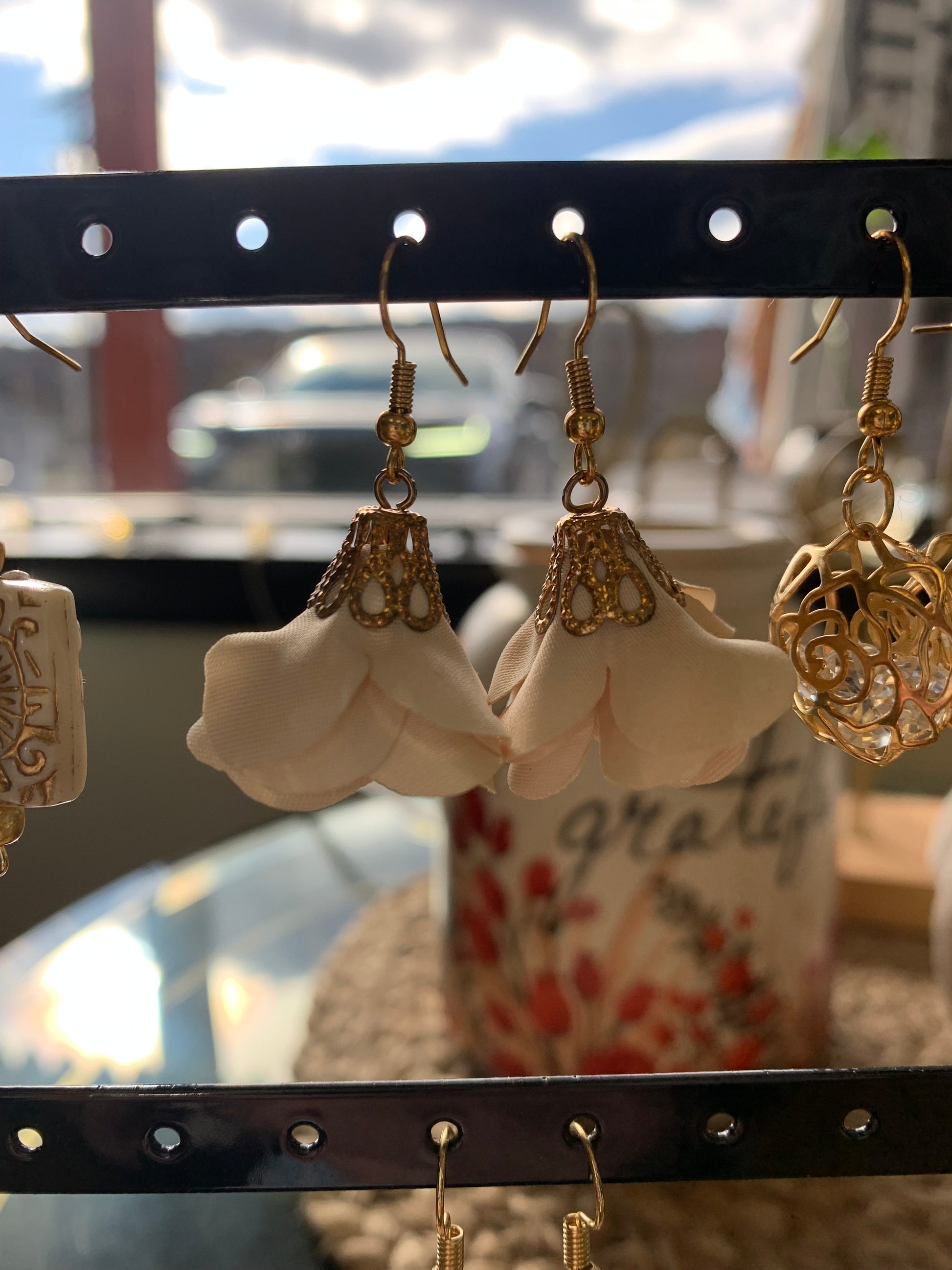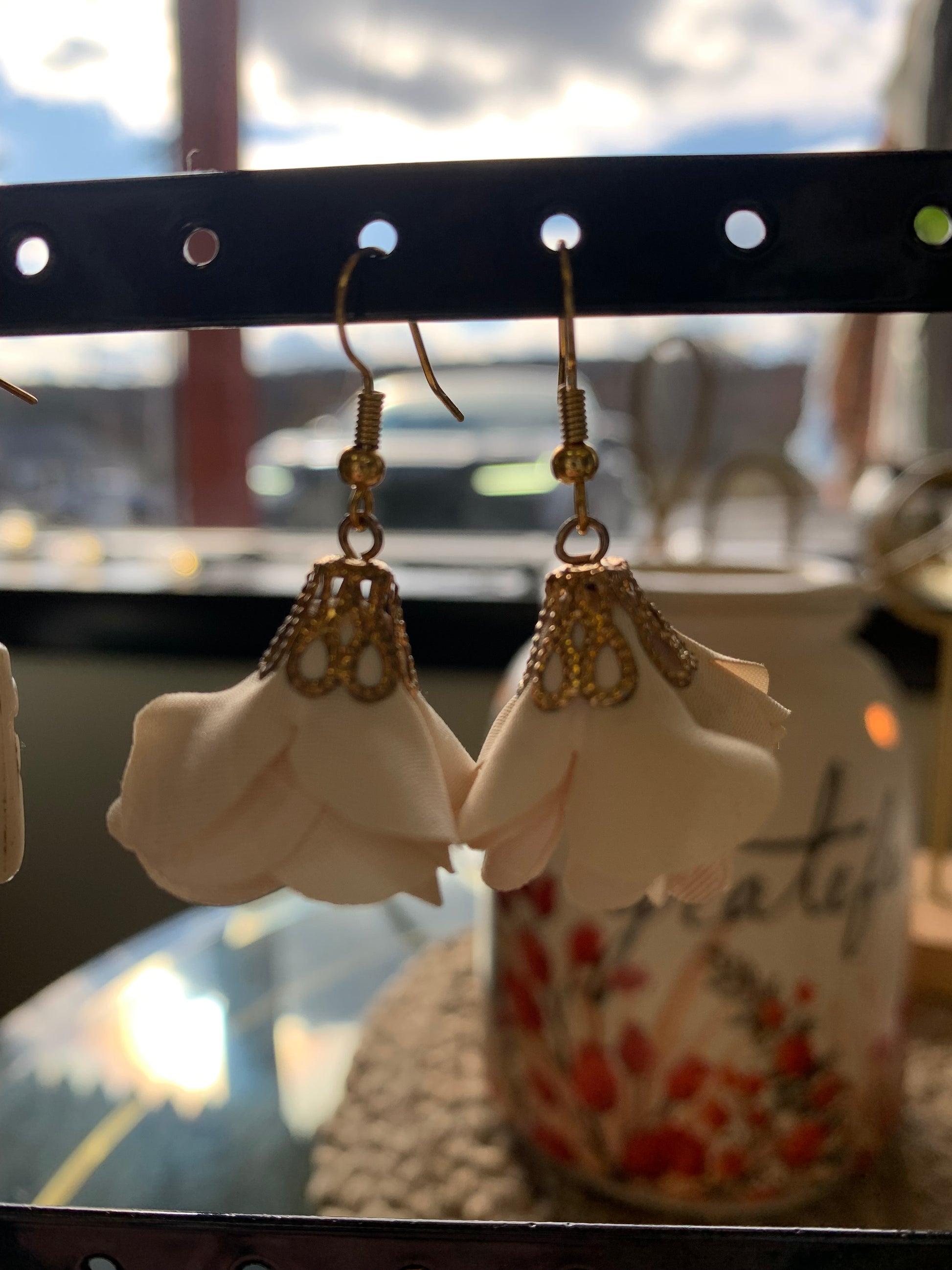 Hanging Rose Earrings! Made from fabric, they feature a delicate design and 18k gold plated findings, ensuring a touch of elegance with a touch of fun. Perfect for spring and summer! 💐
